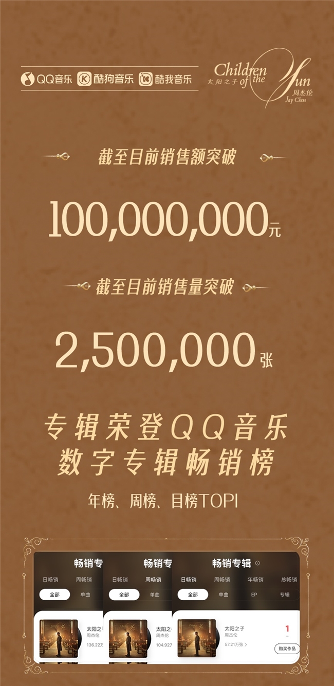 3月25日,华语流行歌手周杰伦第16张个东谈主专辑《太阳之子》在腾讯音乐旗下QQ音乐、酷狗音乐、酷我音乐独家首发上线。自3月19日预售开启,该专辑销量飞速攀升,当今全平台销售额摧折1亿东谈主民币,印证了其弘远的市集呐喊力。