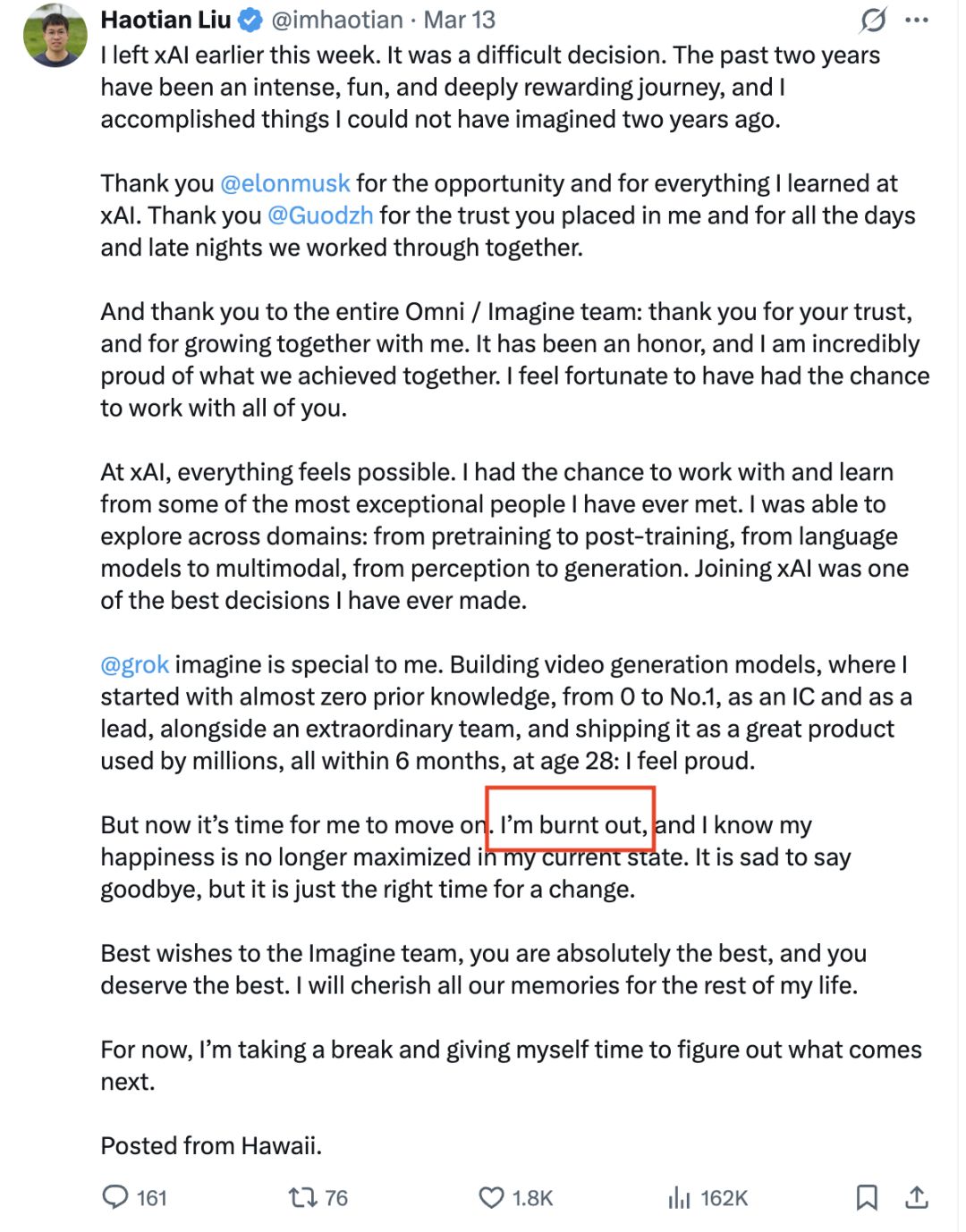 3月13日,认真图像生成家具的首创成员张国栋发帖文告离开公司。随后,另又名纠合首创东谈主刘浩天也在外交媒体上发文,证据早前我方也已去职,并直言“燃尽了”。