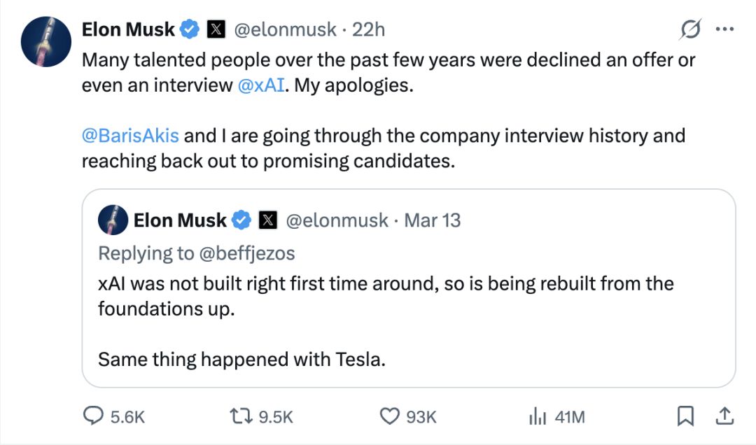 面临中枢团队险些“团灭”的难受场所,一向以刚烈著称的马斯克展现出忽视的内省姿态。