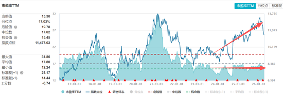 读者们笃信要问,奈何看是功绩增长照旧估值溢价?就以刚上市的家电ETF华宝(159176)为例,对标着中证家用电器指数,曩昔10年维度的市盈率PE-TTM如下图: