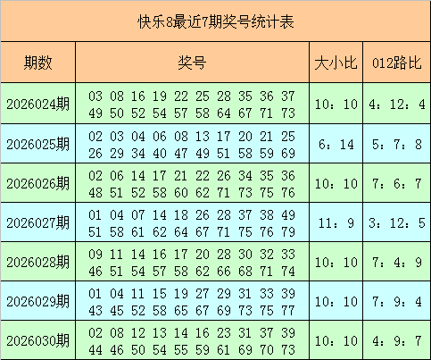 快乐8第2026030期奖号为:02 08 12 13 14 16 23 31 37 39 44 46 50 54 55 59 61 69 70 73,其中奖号012路比为4:9:7,大小比为10:10。