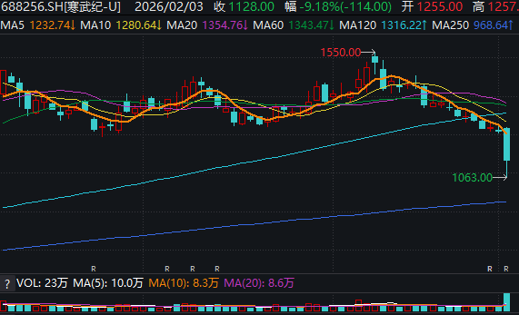 2月3日上午,寒武纪股价迅速暴跌,盘中跌幅一度超过14%,触及1063元/股的低点,公司市值也一度蒸发超700亿元。