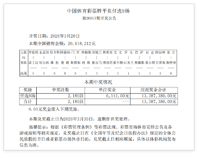佰朔资本 巴萨尤文皆主场赢球 足彩任九开2180注6141元