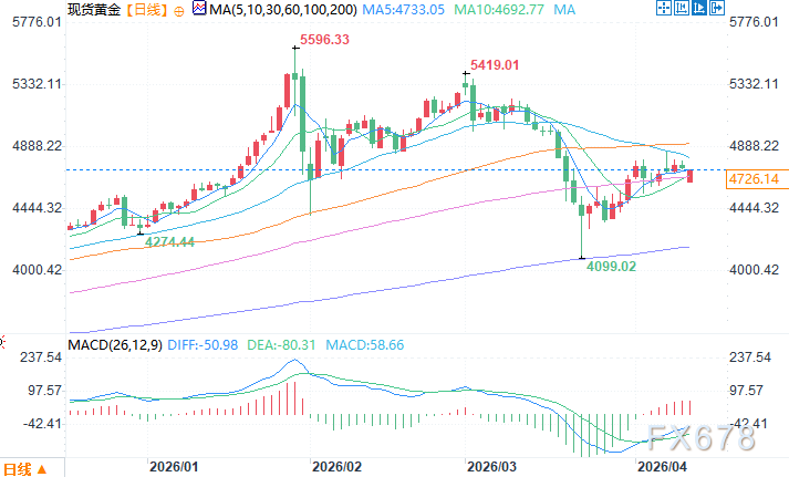 现货黄金日线图 起首:易汇通北京时候4月13日14:55 现货黄金 报 4725.14 好意思元/盎司