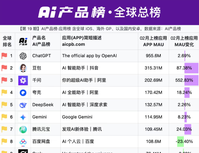 星速优配【大河财立方音讯】3月3日,AI居品榜发布2026年2月公共总榜,数据披露,公共界限内,MAU(月活用户数)排行前三的ai运用分辨为ChatGPT、豆包和千问。其中千问以202.69亿的MAU置身公共第三大ai运用,增速达552.83%,居公共第一。从榜单看,国内ai运用呈现千问与豆包双雄独立的花样。
