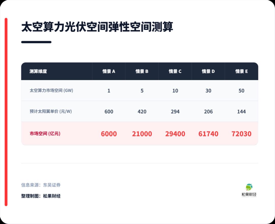 网上流传一份来自证券机构的市场拆分:低轨卫星本身的光伏,到2030年全球市场空间约295亿元,是当前十倍水平;如果进入10GW级太空数据中心部署阶段,按每瓦太阳翼150元估算,光伏部分每年就对应1.5万亿元级别的市场。