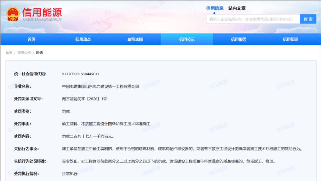 据信用动力最新公示信息,中国电建集团山东电力建树第一工程有限公司,在洛能公司 500 千伏升压站改进神态中,存在偷工减料、使用分辨格建筑材料及构配件、未按想象图纸施工等多项严重违章行动,最终被南边动力监管局处以 297.16 万元罚金。